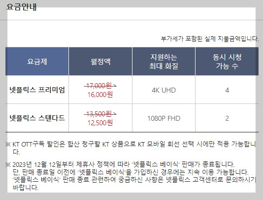 3. KT나 LG U+ 통신사를 이용하는 분 중에 25% 약정할인을 받고 계시는 분은 통신사 부가서비스를 통해 넷플릭스를 이용하시길 추천드립니다. 스탠다드는 월 10,125원, 프리미엄은 월 12,750원으로 이용할 수 있습니다.