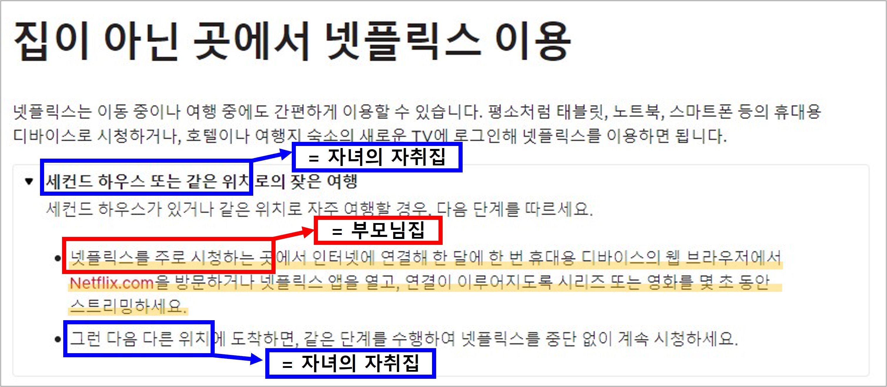 그럼 이제 한 가족이 두 가구에 떨어져 살 경우에 계정을 공유하는 방법을 설명드리겠습니다. 넷플릭스 고객 센터에서 안내하는 [집이 아닌 곳에서 넷플릭스 이용] 방법을 활용할 수 있습니다.