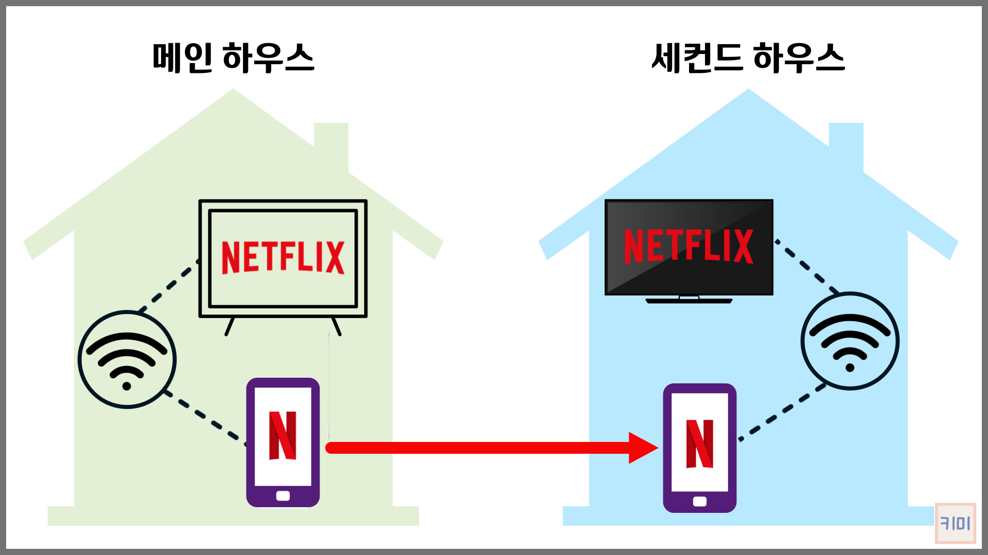 예를 들어, 부모님 집과 자녀의 자취집, 두 곳에 있는 TV에서 넷플릭스 계정을 공유하는 경우를 설명해 보겠습니다.