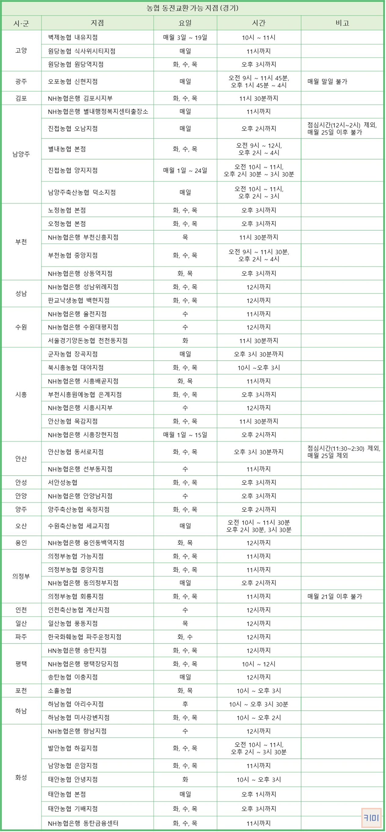 경기도 농협 동전교환 지점 정보