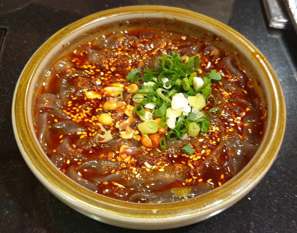 아래 사진은 라오쓰촨의 시그니처 반찬입니다. 이름은 모르겠지만 탕이 나오기 전에 가장 먼저 무료로 제공되는 반찬입니다. 마라 소스에 당면과 땅콩을 넣은 차가운 음식인데 이게 정말정말정말 맛있습니다.