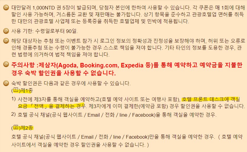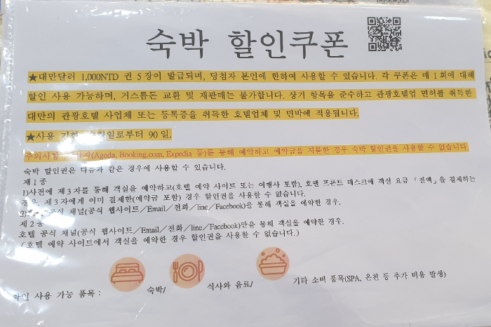 다만 사용 가능한 숙박업소가 제한되어 있어서 대만 여행을 계획 중이시라면 이를 확인하시고 되도록 숙박지원금을 사용할 수 있는 곳으로 예약하시길 추천드립니다.