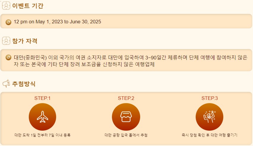 대만 여행을 계획하시는 분들은 대만의 여행지원금 추첨에 대해 들어 보셨을 것 같습니다. 대만에서는 2023년 5월부터 2025년 6월까지 해외 여행객들을 대상으로 여행지원금 20만원을 추첨으로 지급하고 있습니다.