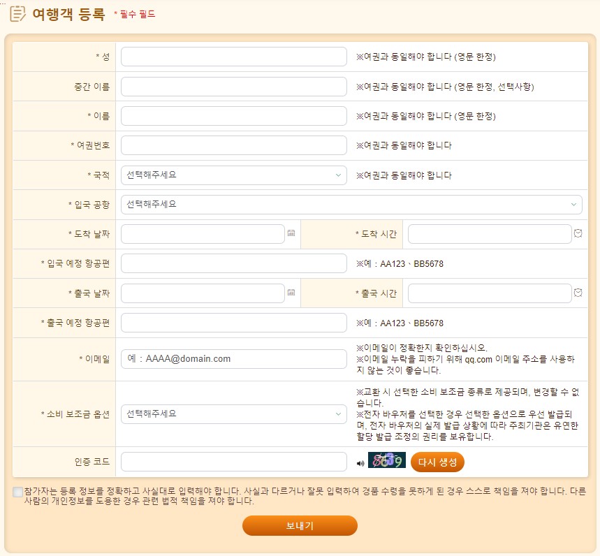 사이트는 한국어로 표기되니까 어렵지 않게 신청서를 작성하실 수 있습니다. 신청서에는 여권번호와 입출국 항공편 정보도 기입해야 합니다.