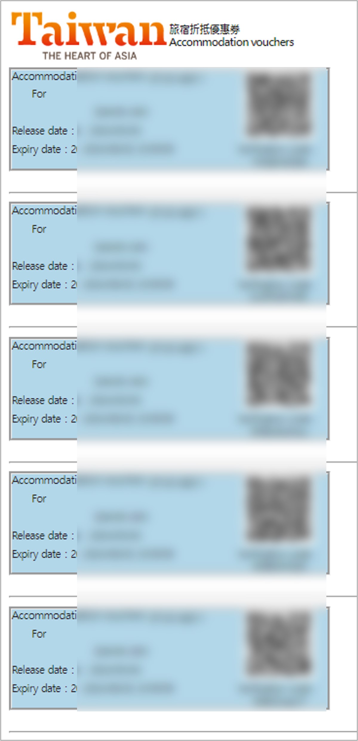 숙박지원금을 받기 위해서는 카운터에서 메일 주소를 제출합니다. 그리고 곧바로 5개의 할인 QR코드가 있는 메일을 받게 됩니다.