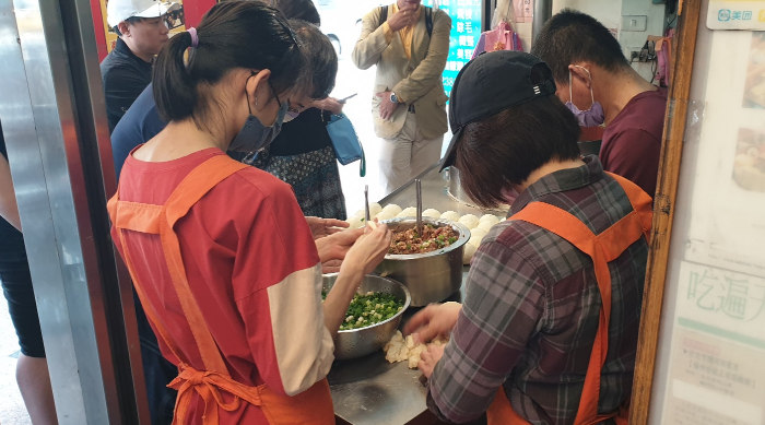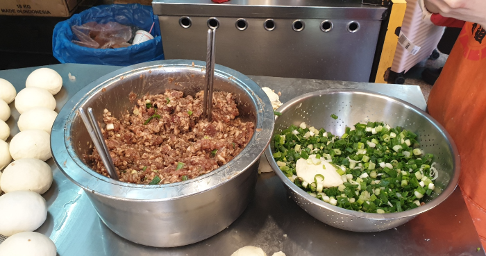 기다리면서 빵 만드시는 모습을 구경할 수 있었습니다. 반죽 속에 고기를 터지도록 가~득 넣고 거기에 파를 찍어서 반죽으로 감싸는 실력이 구경하는 재미가 있었습니다.