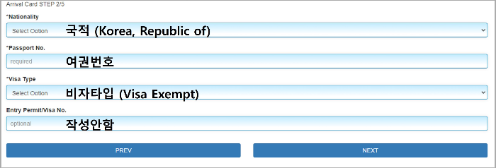 다음 페이지에서 다시 국적, 여권번호, 비자타입(무비자)을 입력합니다.