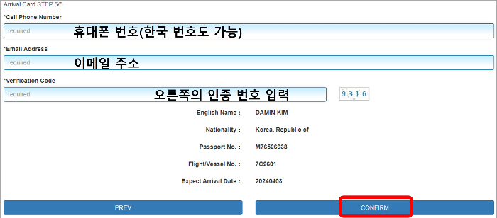 마지막으로 연락처를 작성하고 인증 번호를 입력하면 전자입국신고서 작성이 완료됩니다.