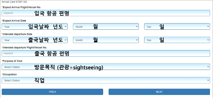 다음은 입국하는 항공기 편면, 입국날짜, 출국날짜, 출국하는 항공기 편명, 방문목적(관광), 직업 등을 작성합니다.