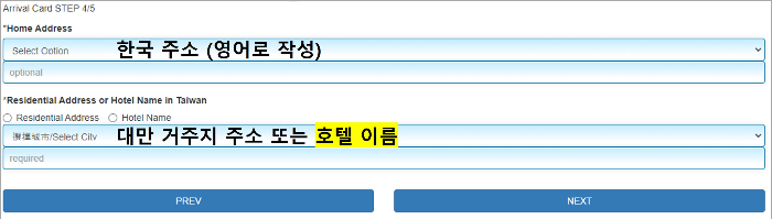 네 번째 페이지는 한국 거주지와 대만 거주지를 작성합니다. 영어로 작성해야 하며, 대만 거주지는 호텔명을 기입해도 됩니다.