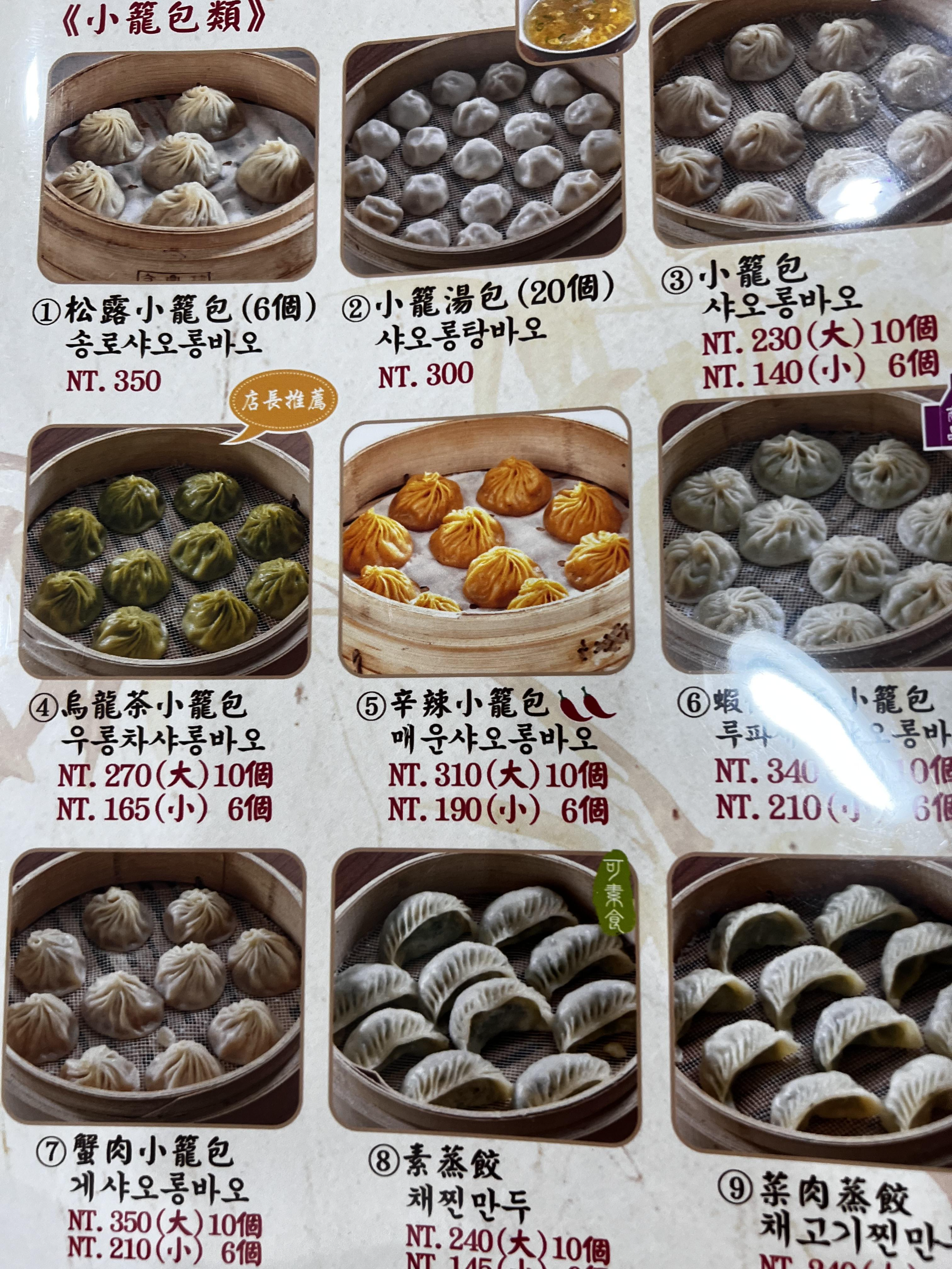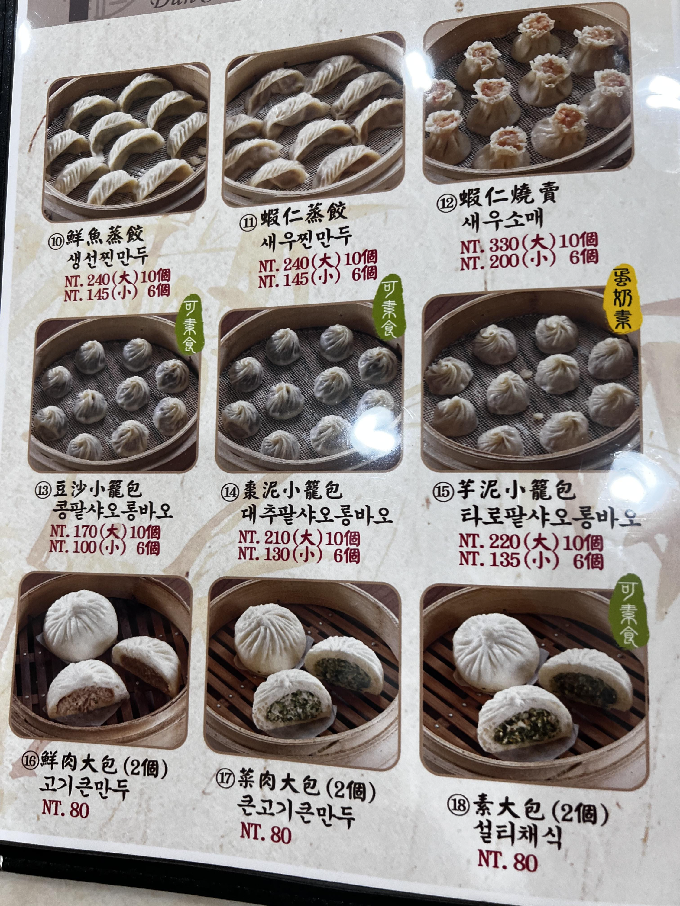 진딘로우는 샤오롱바오 종류만 10가지가 넘습니다. 그 외에 다른 딤섬 종류도 많고, 한국어 메뉴판이 구비되어 있기 때문에 번역기 없이 쉽게 주문할 수 있어서 좋았습니다.