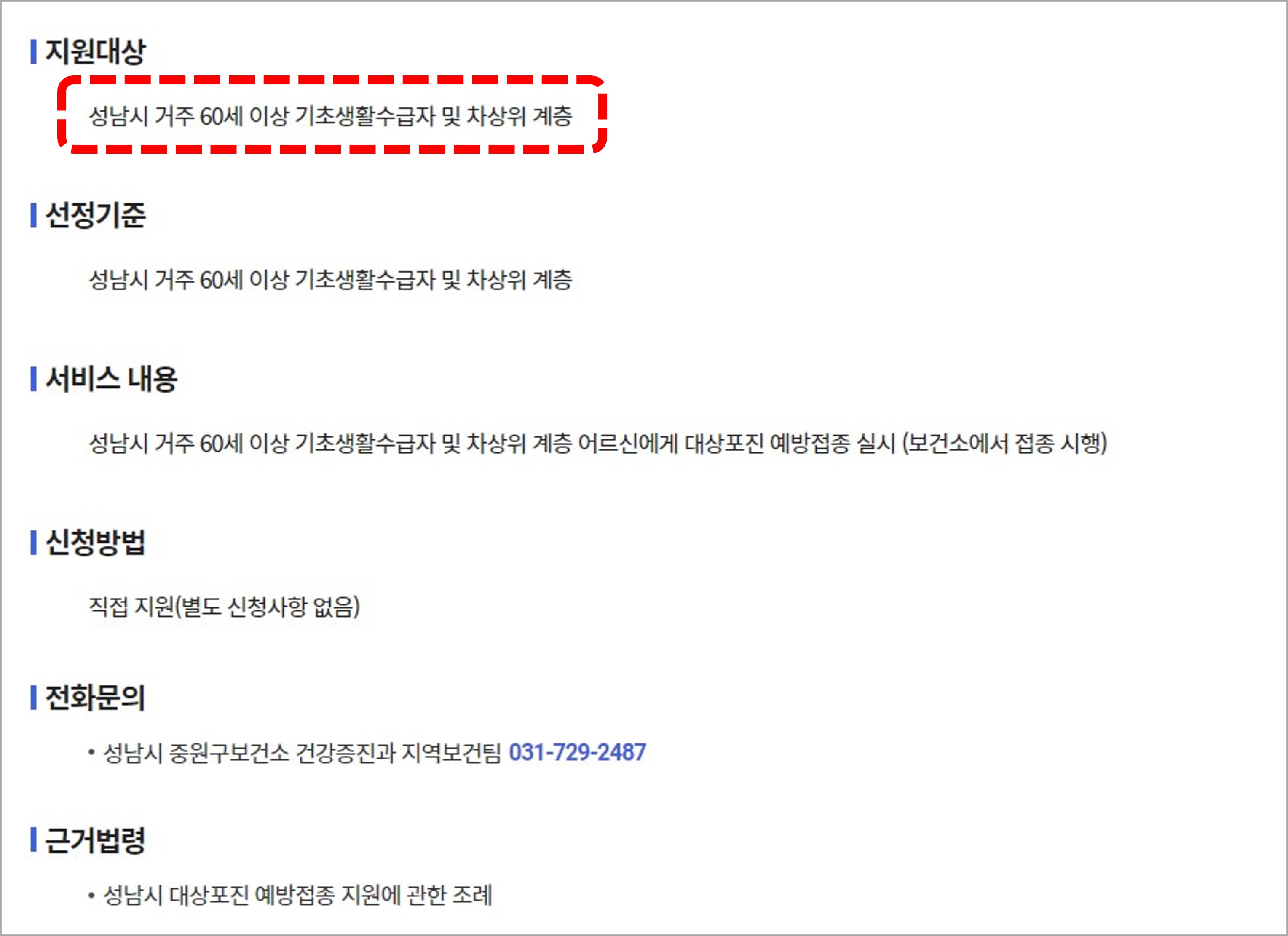 예시로 성남시 지원사업을 확인해 보겠습니다. 성남시에서는 60세 이상 기초생활수급자 및 차상위 계층을 대상으로 지원하고 있습니다.