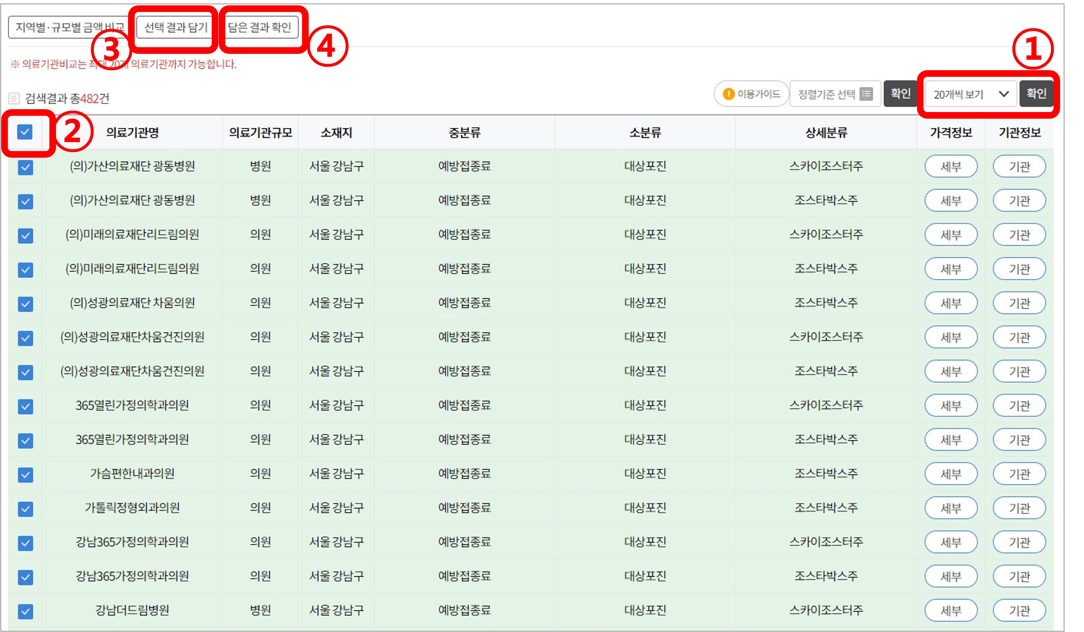 그러면 아래와 같이 20개 병원의 금액을 한번에 확인할 수 있습니다. 이 표에서 금액 항목을 클릭하면 주사 가격을 내림차순 또는 오름차순으로 정렬할 수도 있습니다.
