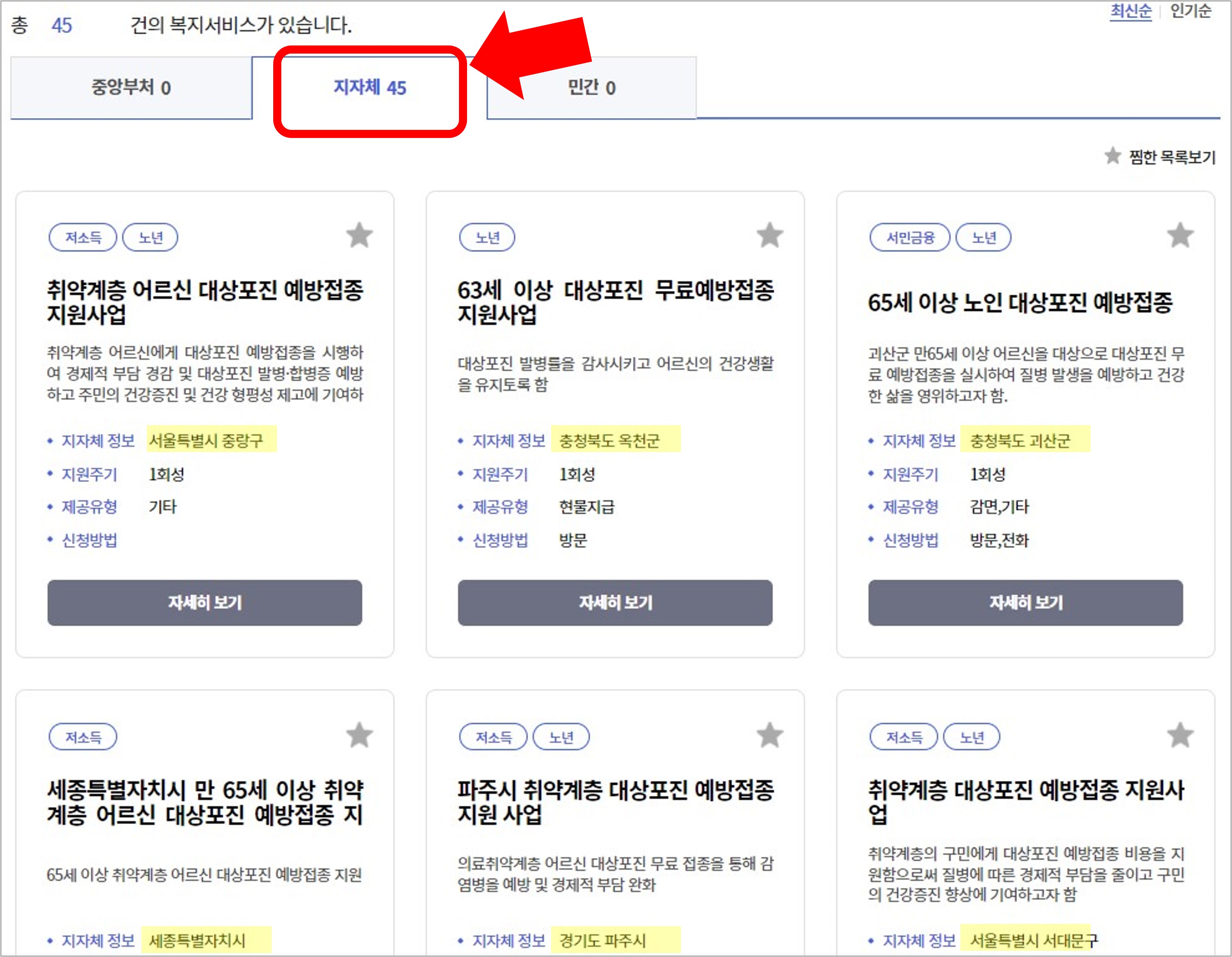 검색 결과에서 지자체를 선택합니다. 중앙부처와 민간 탭에는 검색결과가 없고, 지자체 사업만 45건 검색되었습니다. 여기서 본인이 거주하는 지자체가 있는지 찾아보시면 됩니다.