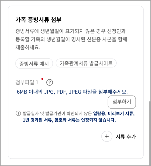 ② 가족 증빙서류 첨부 : 주민등록등본 또는 가족관계증명서 등의 서류를 첨부합니다.