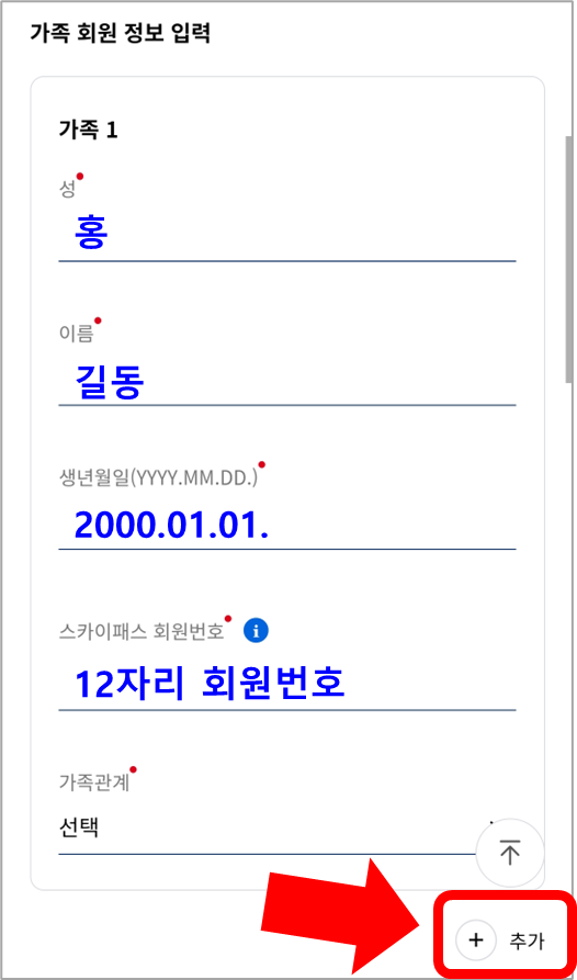 ① 가족 회원 정보 입력 : 신청인 본인을 제외하고 등록하려는 가족의 정보를 기입합니다.