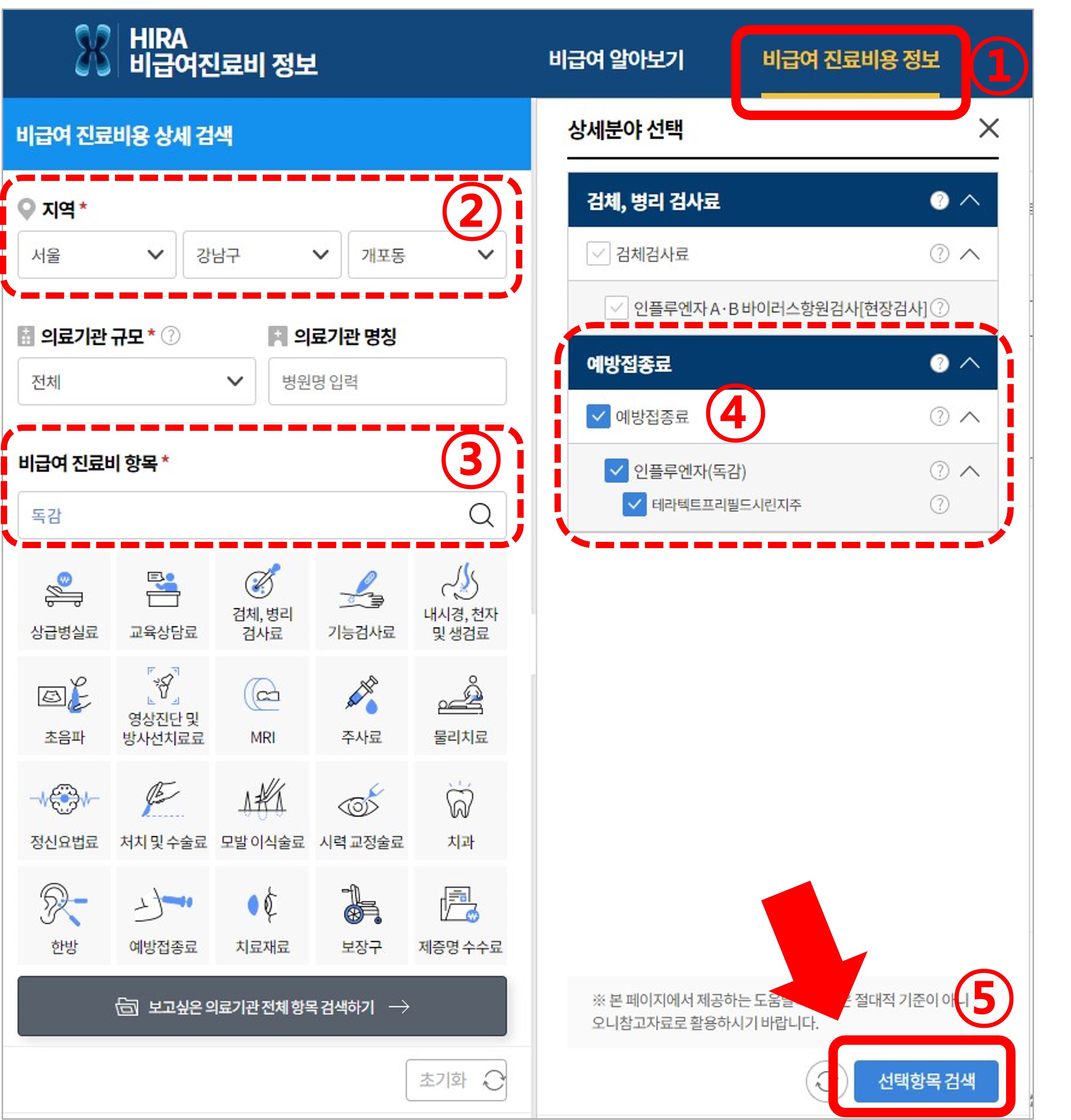 2) 거주지역을 선택하고, 독감을 검색합니다. 그리고 예방접종료를 선택한 뒤 선택항목 검색을 클릭합니다.