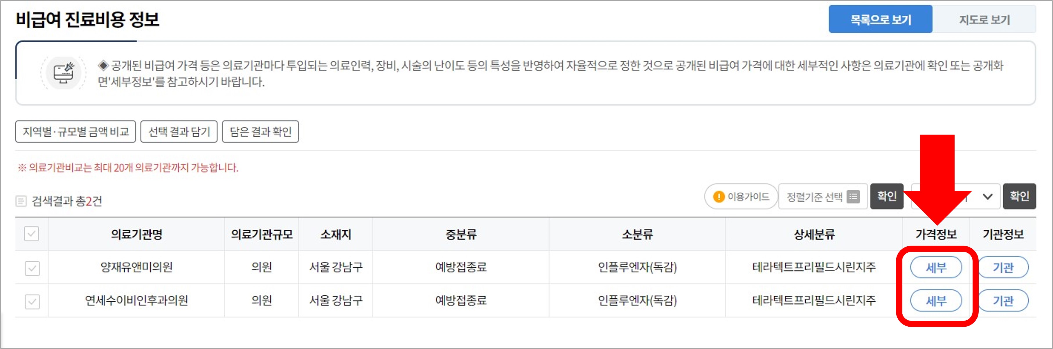 3) 의료기관 명단에서 가격정보 세부를 클릭합니다.
