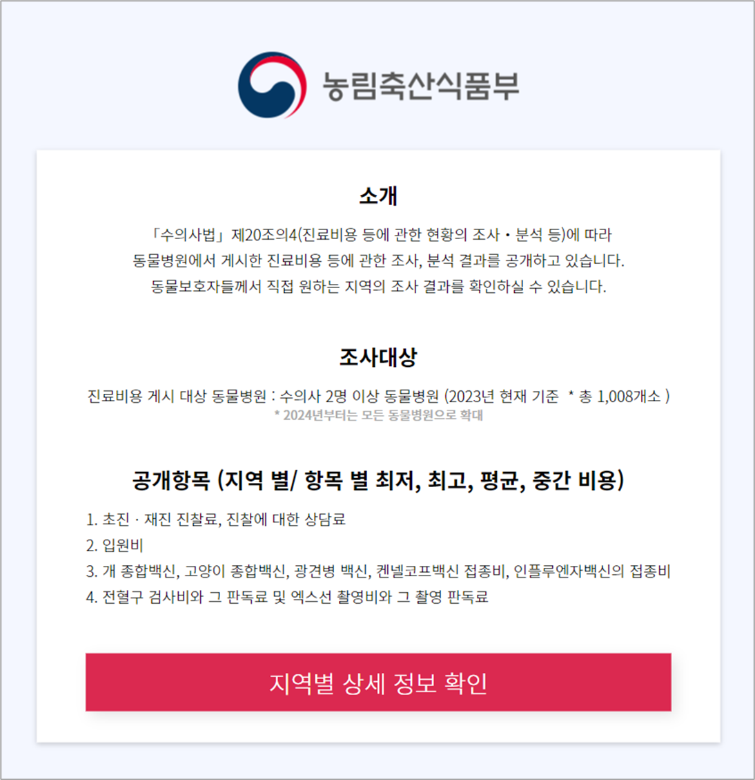 이번 글에서는 지역별 동물병원 진료비의 중간, 최고, 최저, 평균 비용을 확인하는 방법을 안내해 드리겠습니다.