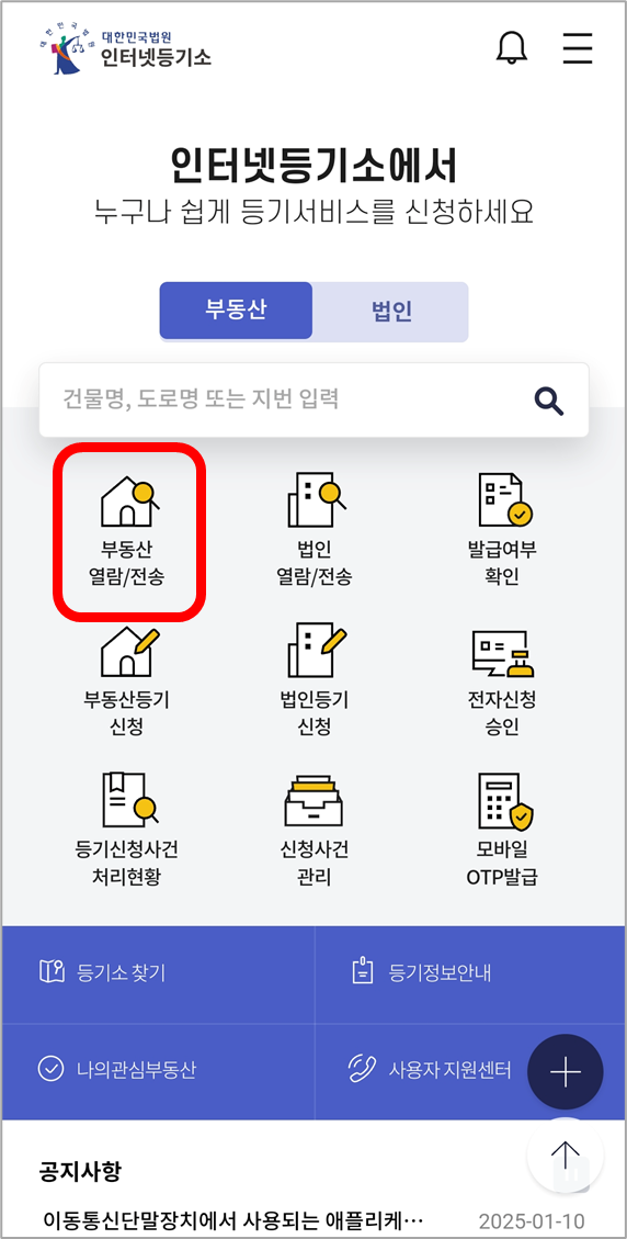 모바일에서 등기부등본을 열람하려면 인터넷등기소 앱을 설치해야 합니다.