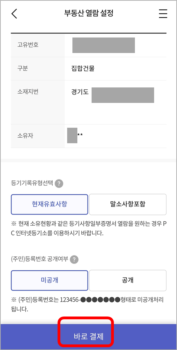 결제 후 바로 등기를 열람할 수 있습니다.