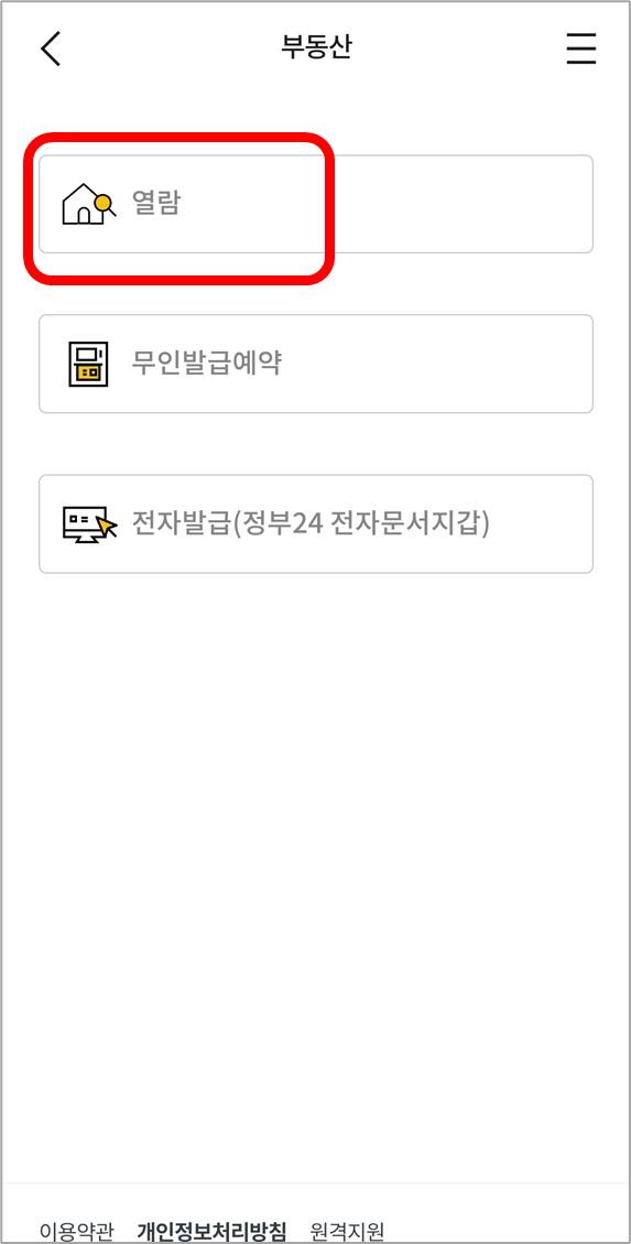 로그인 후 [부동산 열람/전송] 페이지에서 [열람]을 선택합니다.