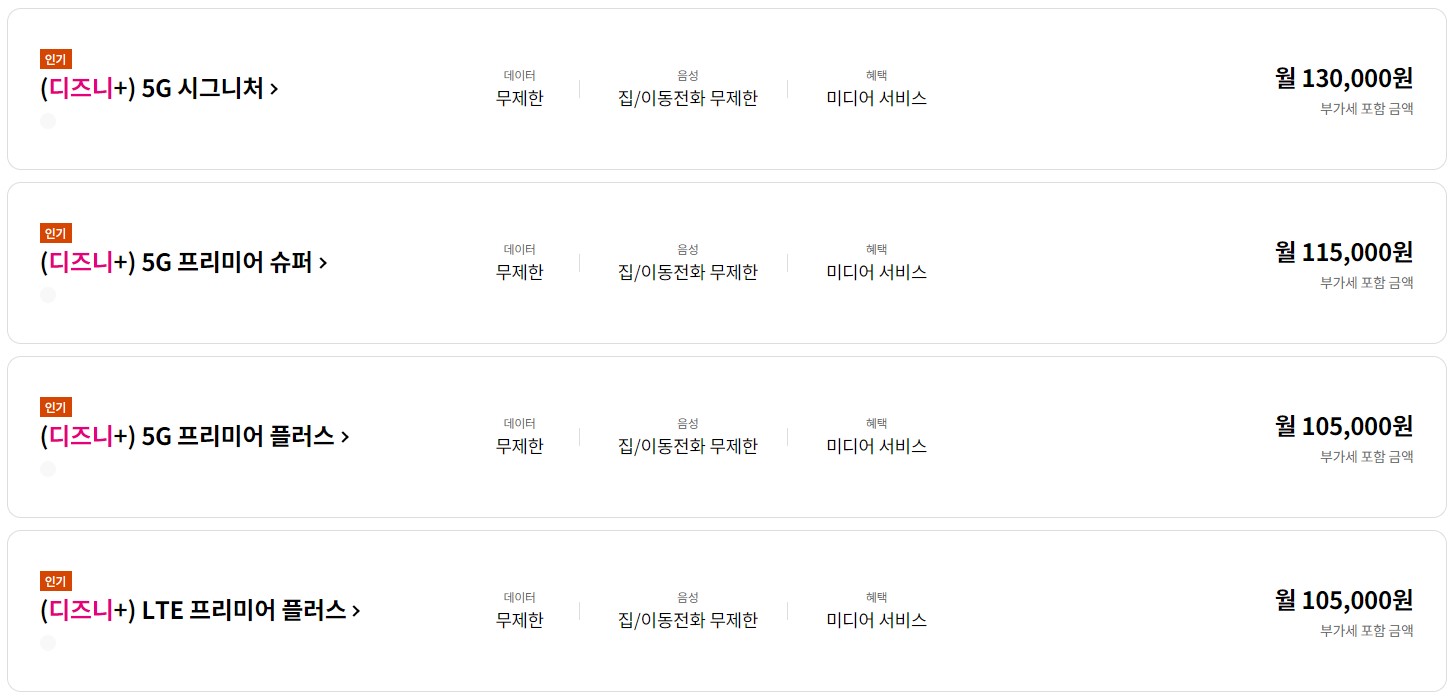 LG U+에서는 5G/LTE와 디즈니플러스를 결합한 형태의 요금제를 제공하고 있습니다. 데이터 무제한과 디즈니플러스 구독은 월 105,000원이며, 자세한 옵션과 가격은 LG U+ 홈페이지에서 확인해 보시기 바랍니다.