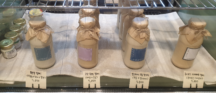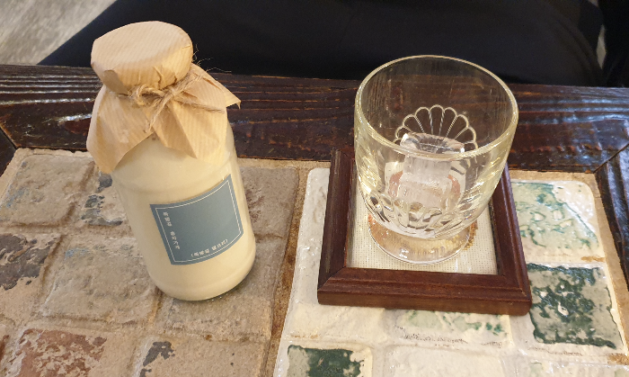 여러 가지 밀크티 중에서 저는 뚝방길 밀크티를 주문했습니다. 밀크티는 쇼케이스에 진열된 병을 그대로 잔과 함께 서빙해 주십니다.