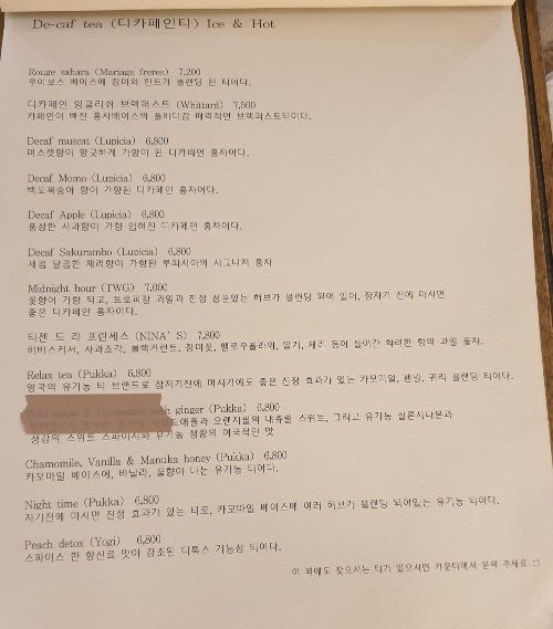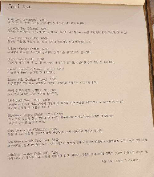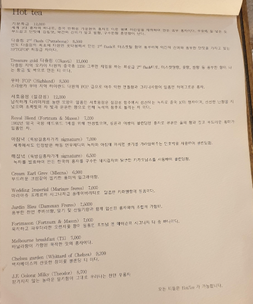 음료는 핫 티와 아이스 티, 디카페인 티, 밀크티, 커피 등으로 다양하게 있습니다. 차 종류가 굉장히 다양해서 좋았습니다. 심지어 이 외의 티는 카운터에 문의하시라는 문구가 있는 걸 봐선 메뉴에 없는 티도 여러 가지 구비되어 있는 것 같습니다.