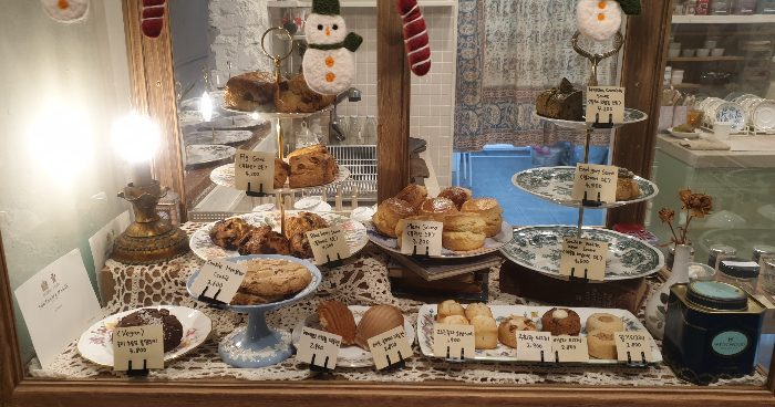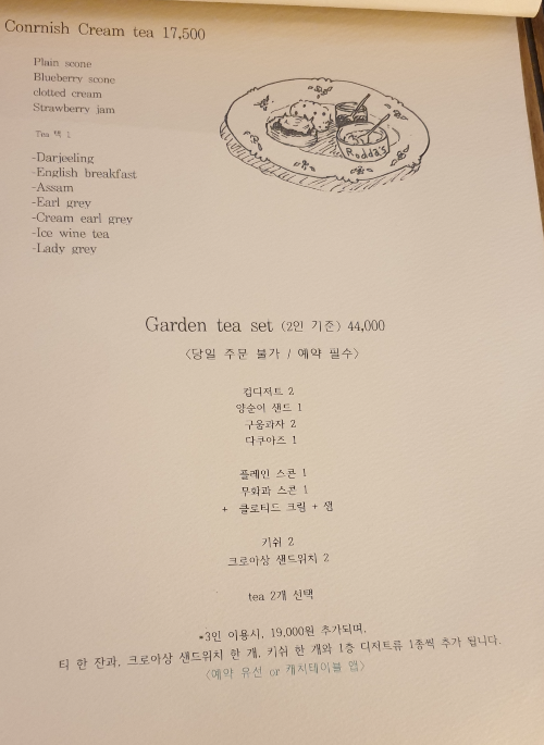 티푸드는 크림티 세트, 가든 티 세트, 샌드위치 등이 있습니다. 그리고 개별 스콘, 마들렌, 티그레, 쿠키, 케이크 등은 쇼케이스에서 골라서 주문할 수 있습니다.