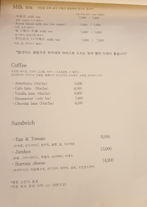 차는 7,000 ~ 8,500원 선이고, 밀크티는 7,800원입니다. 두 분이 방문하신다면 크림티 세트(17,500원)에 밀크티 하나 주문해서 드시는 것을 추천 드립니다.