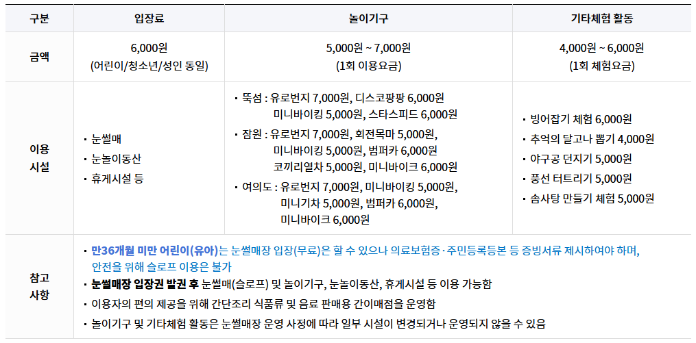 눈썰매장 이외의 시설물과 체험활동은 별도의 이용요금을 지불해야 합니다.