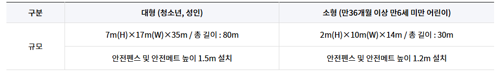 눈썰매장 슬로프는 대형과 소형 두 가지가 운영되며, 연령에 따라 이용할 수 있는 슬로프가 나뉩니다.