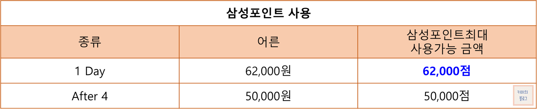 삼성포인트를 가지고 계신 경우, 결제 금액의 100%까지 삼성포인트를 사용할 수 있습니다. 따라서 삼성포인트 62,000점을 사용하면 롯데월드를 무료로 이용 가능합니다.