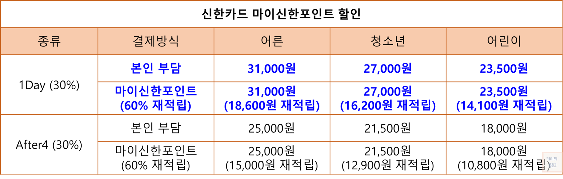 즉, 재적립되는 금액을 제외하면 본인 부담 50%, 포인트 사용 20%로 총 30% 할인 혜택을 받게 됩니다. 현장 매표소 또는 온라인 예매시 신한포인트를 사용하시면 됩니다.