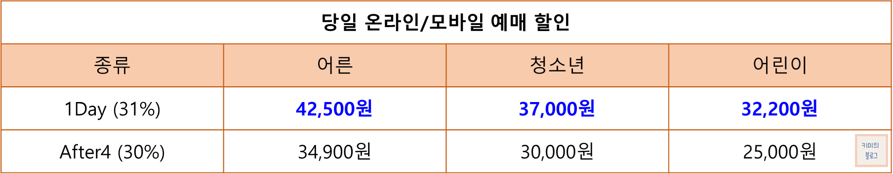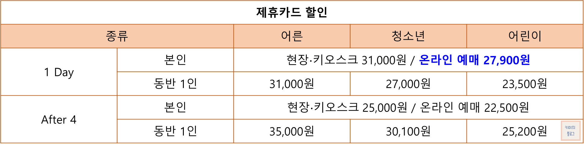 방문 당일 온라인 또는 모바일 예매 시 31% 할인 혜택을 받을 수 있습니다.