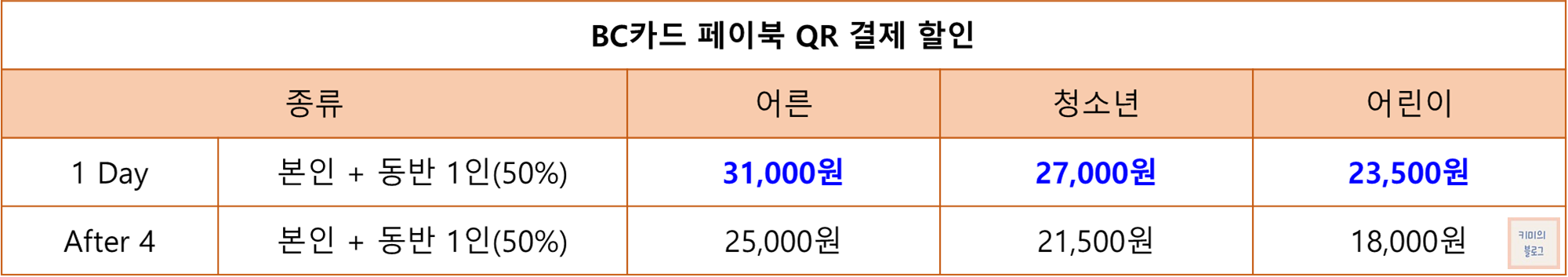 BC카드 페이북 QR 결제할 경우 본인과 동반 1인까지 50% 할인을 받을 수 있습니다. 할인율도 높고 방법도 간단해서 BC카드를 소지하신 분들께 추천드립니다.