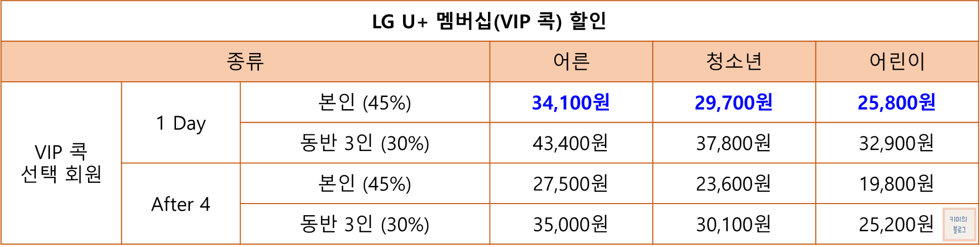 LG U+ 멤버십 VIP 콕 선택 회원은 본인 45%, 동반 1인 30% 할인 혜택을 받을 수 있습니다.