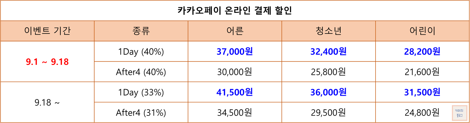 9월 18일까지는 카카오페이로 온라인 예매 시 40% 할인 혜택을 받을 수 있습니다.