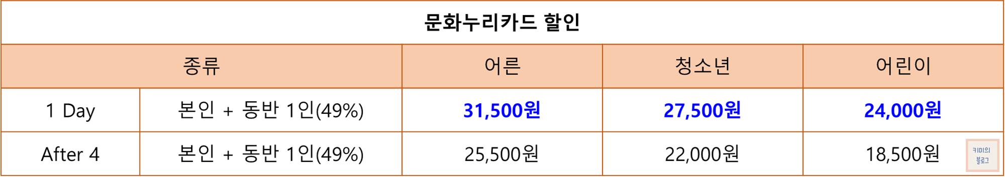 문화누리카드를 소지한 본인과 동반 1인은 49% 할인 혜택을 받을 수 있습니다.