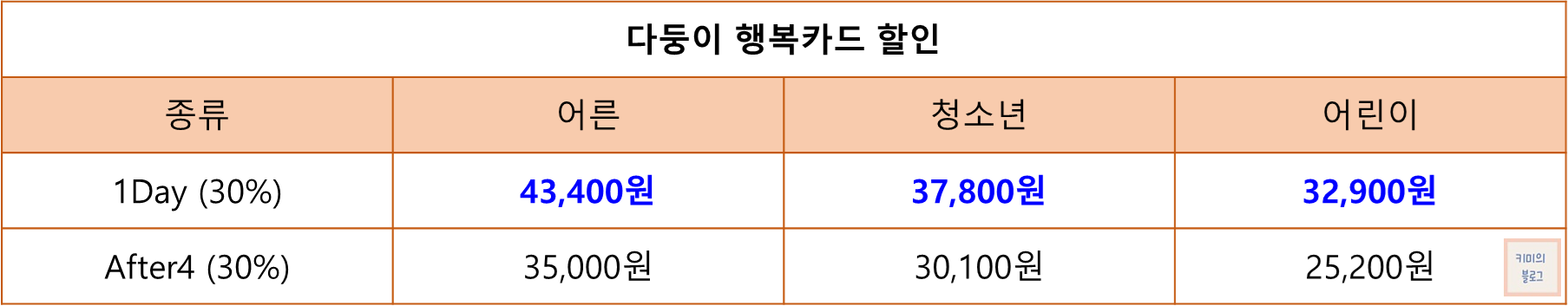 다둥이 행복카드 회원 가족 본인은 30% 할인 혜택을 받을 수 있습니다. 현장 매표소에서 다둥이 행복카드를 제시해야 합니다.