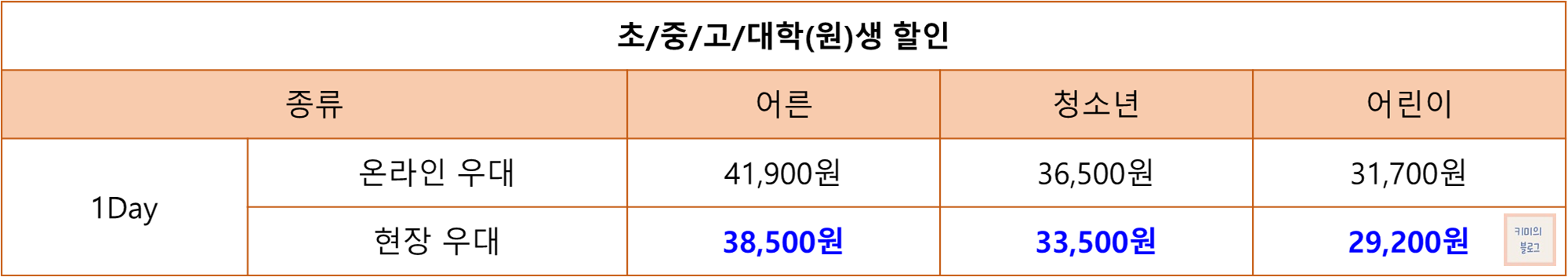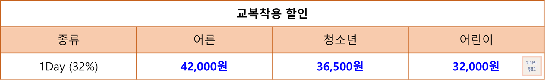 교복을 착용하고 현장 매표소에서 1일권 구매 시 32% 할인 혜택이 적용됩니다.