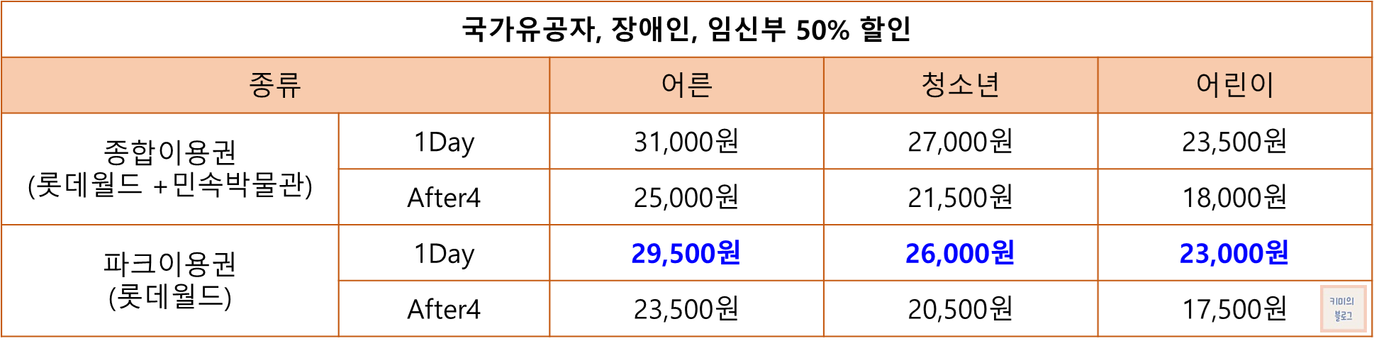 국가유공자와 장애인은 본인 및 동반 1인까지, 임신부는 본인만 50% 할인 혜택이 적용됩니다.