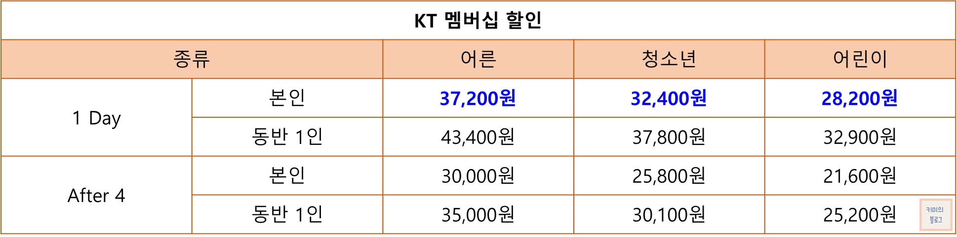 KT 멤버십은 모든 등급의 회원 본인 40%, 동반 3인 40% 할인 혜택을 받을 수 있습니다.