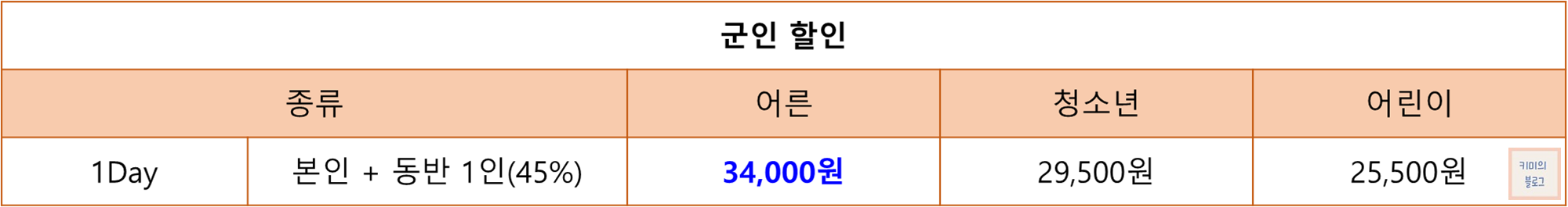 육군, 해군, 공군, 의경, 해경, 카투사, 의무 소방관, 현역 간부, 군무원, 사관생도, 간부후보생 학군단, 상근예비역 등의 군인은 동반 1인까지 45% 할인 혜택을 받을 수 있습니다.