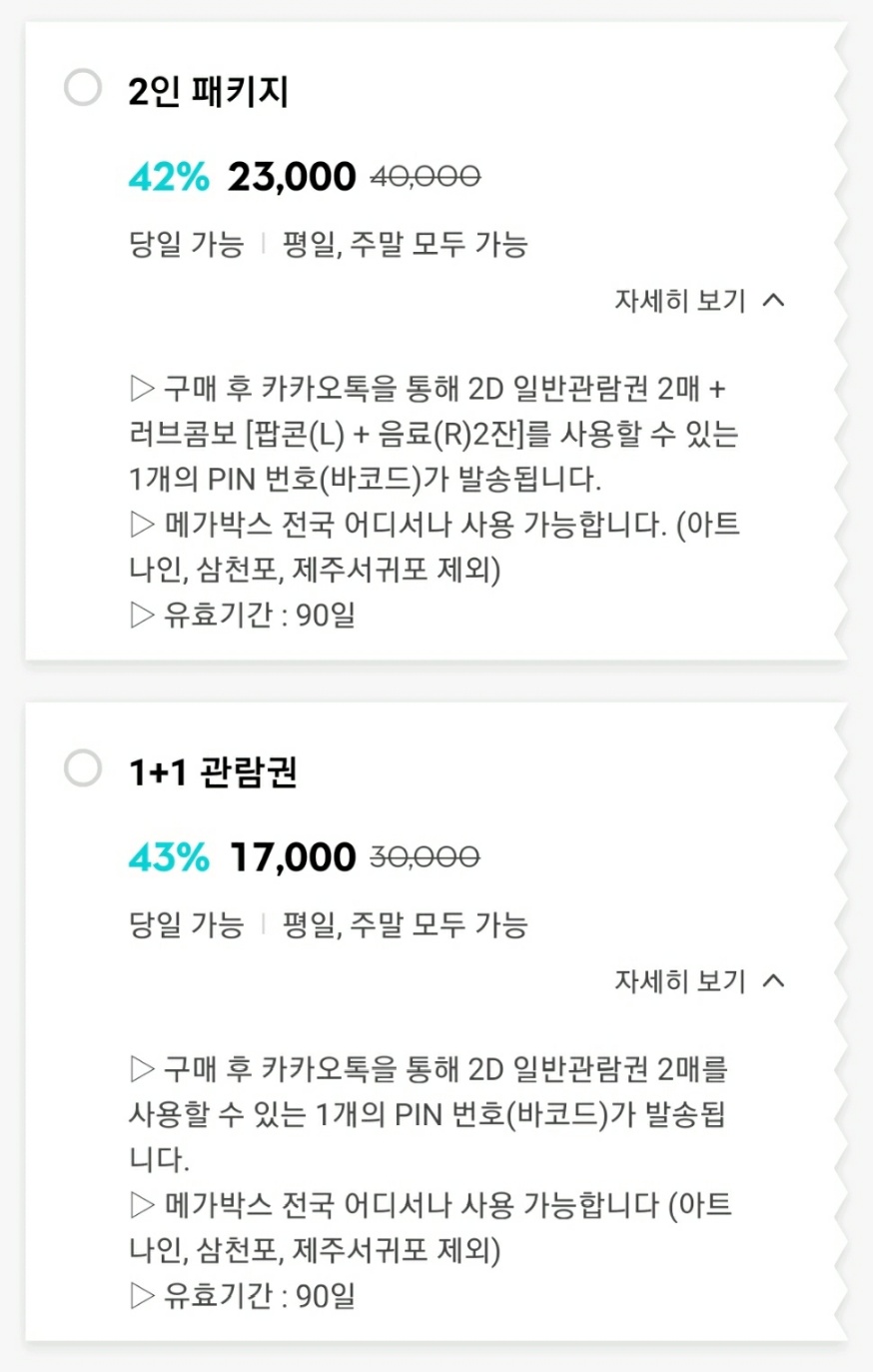 43% 할인되는 1+1 관람권과, 러브콤보 세트가 포함된 2인 패키지, 두 종류가 있습니다.