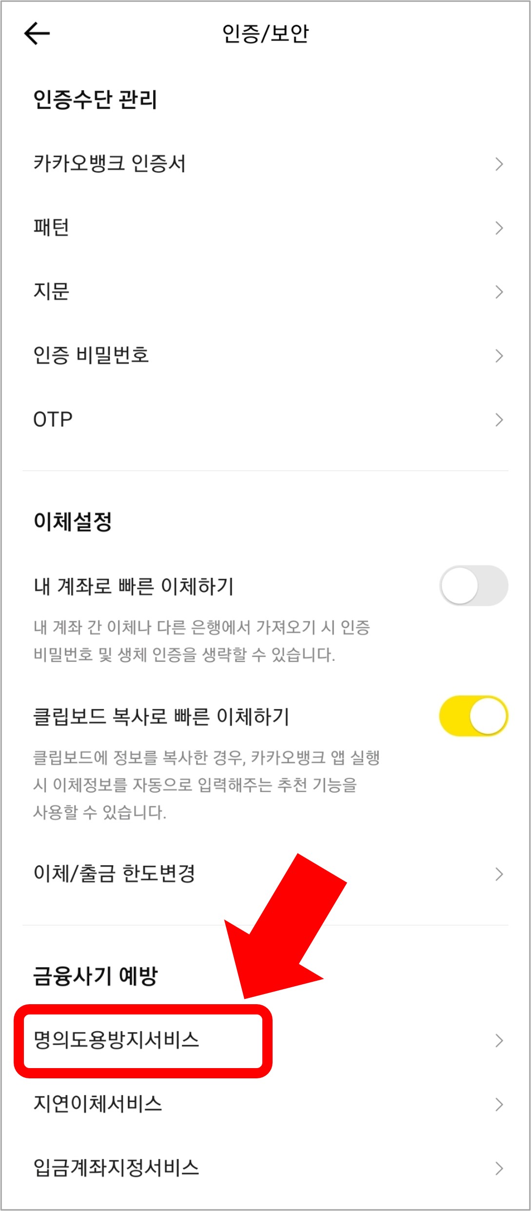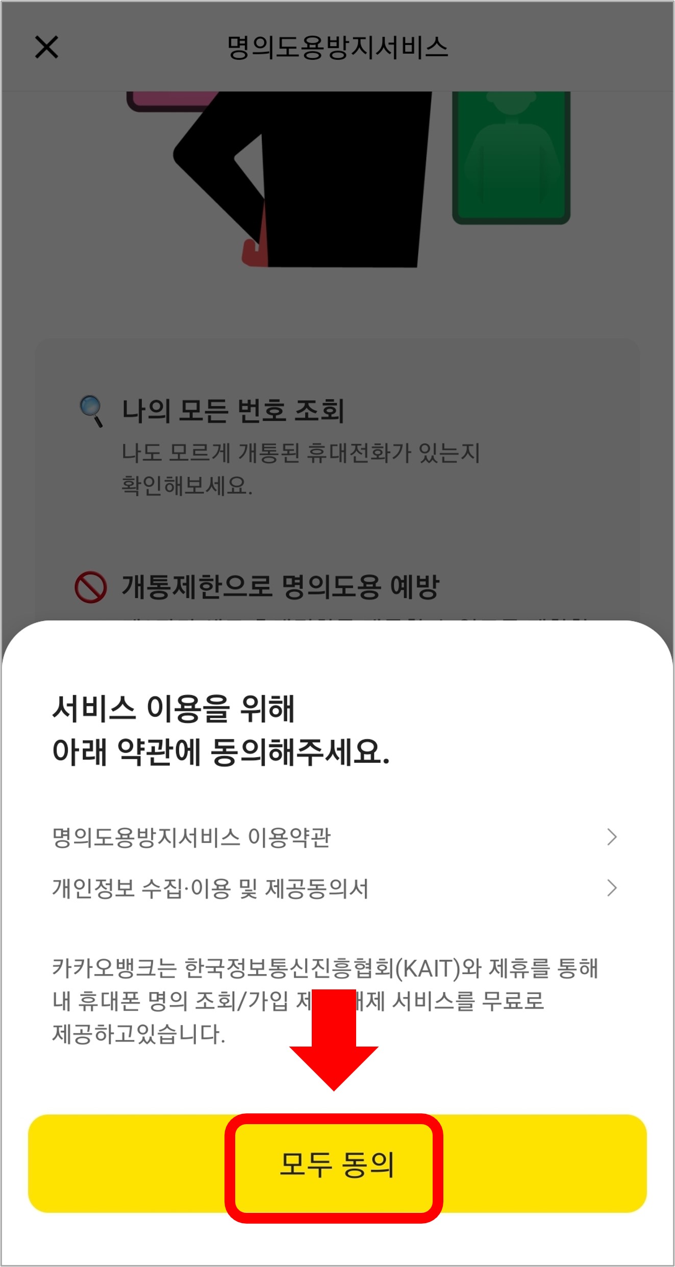 카카오뱅크에서 명의도용방지 서비스를 이용하는 방법은 다음과 같습니다.