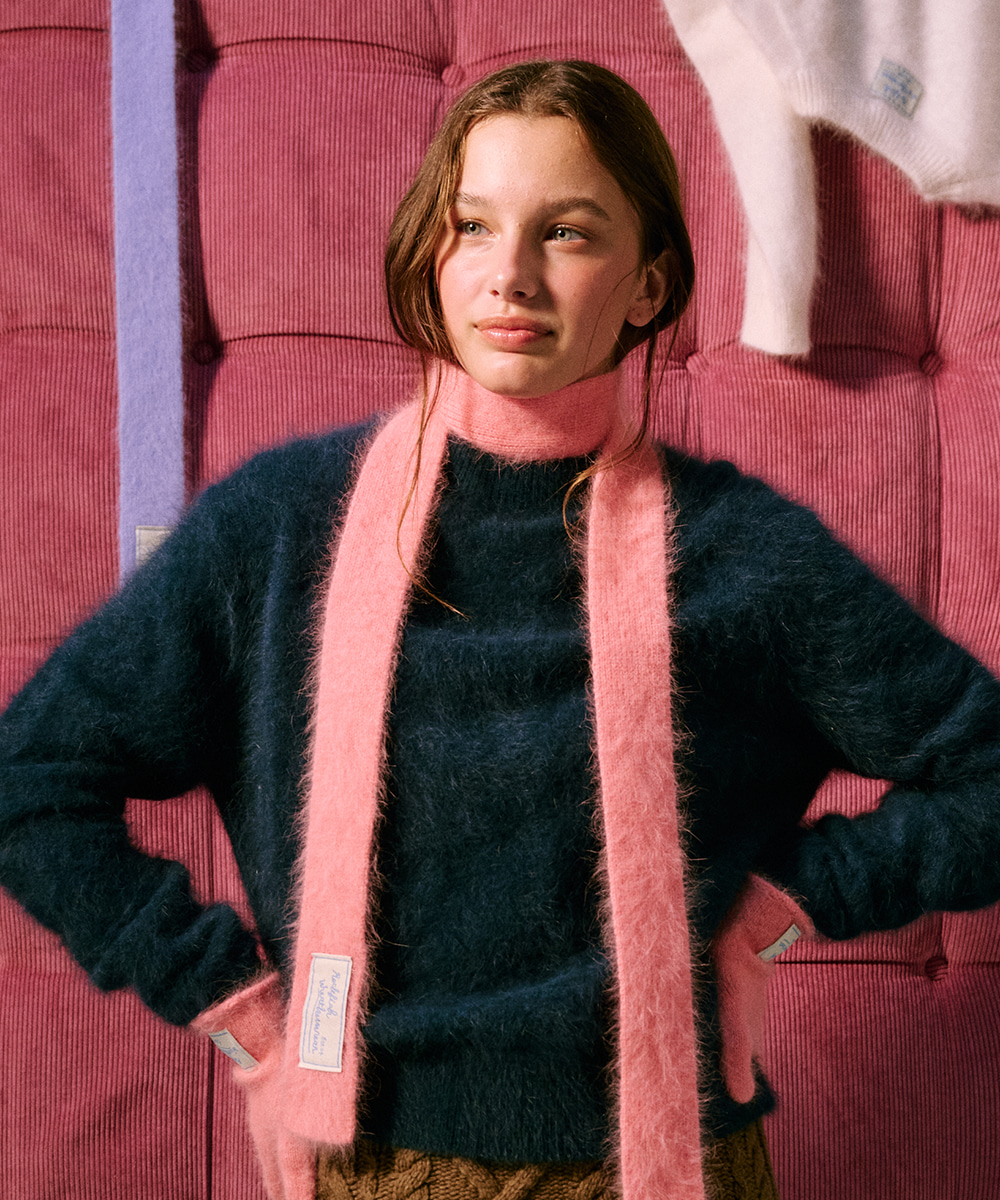 얇고 보송한 텍스쳐의 FUZZY MUFFLER(37,050원)는 그레이, 블루, 코랄 3가지 색상이 있으며, 트윌리 스카프처럼 귀엽게 코디하기에 좋습니다.