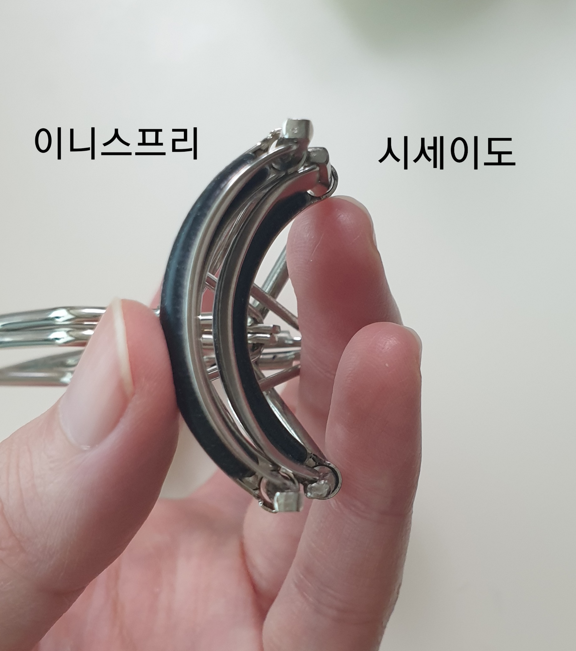 우선 시세이도는 18R, 이니스프리는 19R로 이니스프리가 좀 더 커브가 깊습니다. 그리고 속눈썹을 집는 아치의 길이도 이니스프리가 살짝 더 긴 편입니다. 그리고 두 뷰러를 나란히 찍은 사진을 보시면 이니스프리 뷰러가 좀 더 넓게 벌어지는 것을 확인할 수 있습니다. 그 덕분인지 시세이도 뷰러를 사용할 땐 가끔 속눈썹이 빠지거나 찝히는 경우가 있었는데, 이니스프리 뷰러를 사용할 땐 그런 경우가 거의 없었습니다.