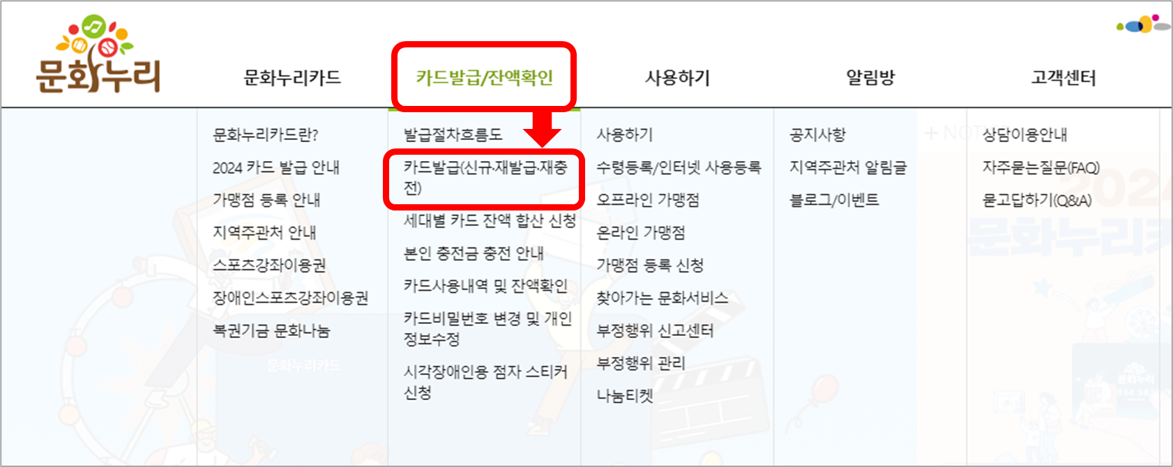 문화누리카드 홈페이지 접속 ▶ 카드발급/잔액확인 ▶ 카드발급(신규·재발급·재충전) ▶ 본인 인증 후 신청 ▶ 카드 수령